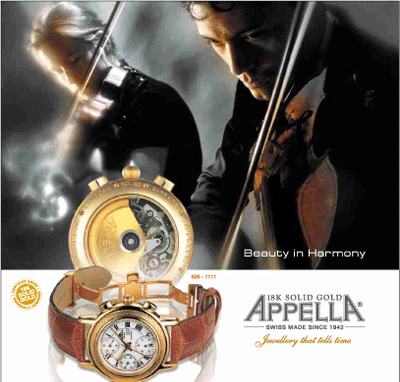 Аppella всегда оставалась верна традиционным принципам создания совершенных часов. Значительный рост производства не противоречит основной философии компании: Appella Sarl прилагает все усилия, чтобы выпускать изделия высокого качества по оптимальным ценам, доступным для большинства потребителей. Компания Appella поддерживает обширный ассортимент: от классических моделей с кварцевыми механизмами до механических изделий с автоподзаводом. Сочетая гармонию классики и современные дизайнерские разработки, Аппелла соединяет моду и традиции.